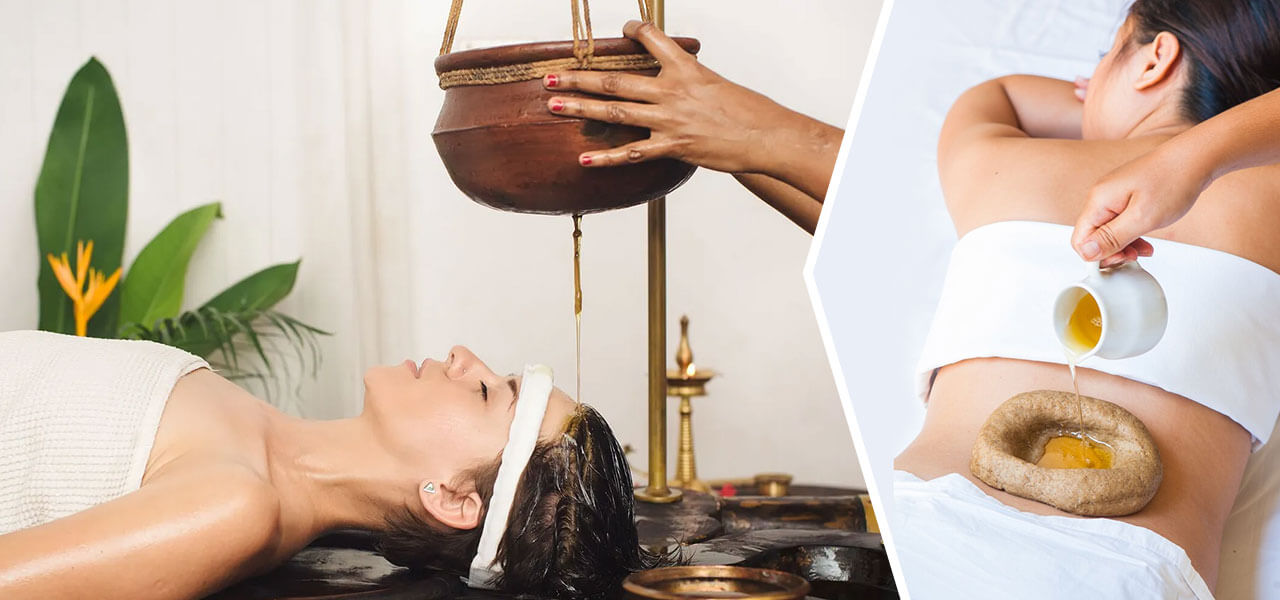 Shirodhara involves gently pouring liquids over the forehead followed by oscillatory movements. The name comes from the Sanskrit words shirah (head) and dhara (stream). The liquids used in Shirodhara depend on what condition is being treated, but can include medicated oils, milk, buttermilk, or even plain water depending on the condition of the patient. There are specialized forms of Shirodhara called Ksheeradhara (with milk), Thakradhara (with buttermilk), Tailadhara (with oils) and Jaladhara (with water). Pouring of warm oils used stimulates and soothes the hypothalamus, thereby regulating the functions of the pituitary gland and inducing sleep. Shirodhara stimulates Marma’s or Vital Points in the head and improves circulation. The warm oils used for Shirodhara also cause vasodilatation of all the channels and thereby improve the blood circulation of the brain. Shirodhara also reduces the level of stress hormones such as Adrenaline and Noradrenaline and thus relaxes the mind. The benefits include-